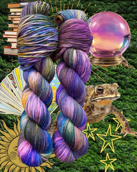 a bright variegated lavender yarn with streaks of green, purple, gold, and blue