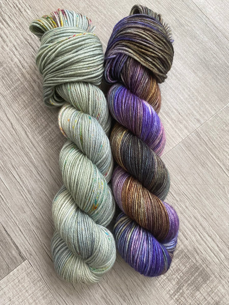 A set of two matching skeins of hand dyed Sister Ananse Yarn. One skein of “Pearlescent”, a brown Purple, blue and iris colorway, and one skein of greenish grey yarn with light multucolored speckles.